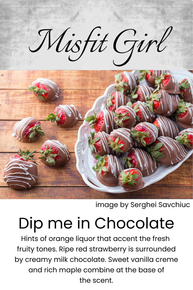 Indulge in Dip me in Chocolate, a luxurious blend of ripe red strawberry and creamy milk chocolate with hints of orange liquor. Sweet vanilla creme and rich maple notes provide the perfect base for this irresistible scent. Elevate your senses and treat yourself today.