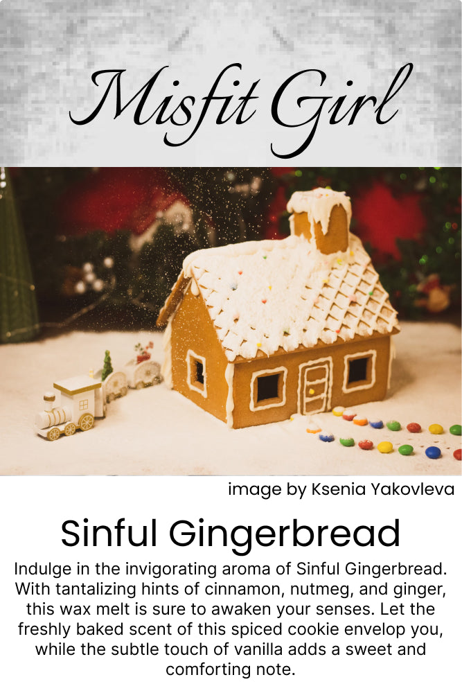 Indulge in the invigorating aroma of Sinful Gingerbread. With tantalizing hints of cinnamon, nutmeg, and ginger, this wax melt is sure to awaken your senses. Let the freshly baked scent of this spiced cookie envelop you, while the subtle touch of vanilla adds a sweet and comforting note.