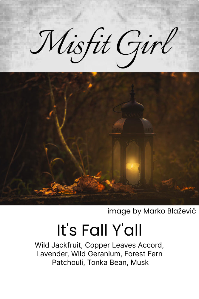 Get ready for the autumn season with It's Fall Y'all! Experience the warm and cozy scents of Wild Jackfruit, Lavender, and Forest Fern, while basking in the earthy notes of Patchouli and Musk. Let the Copper Leaves Accord and Wild Geranium transport you to a serene forest as you indulge in the comforting aroma of Tonka Bean. Fall never smelled so good!